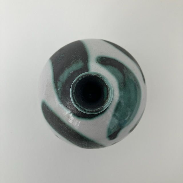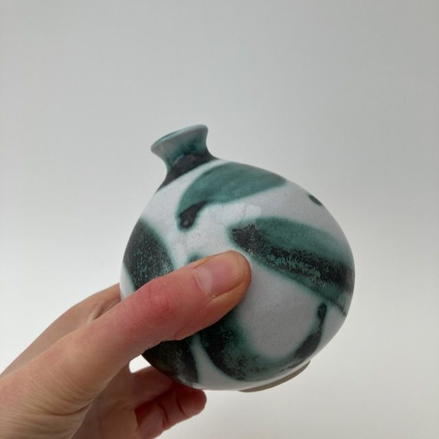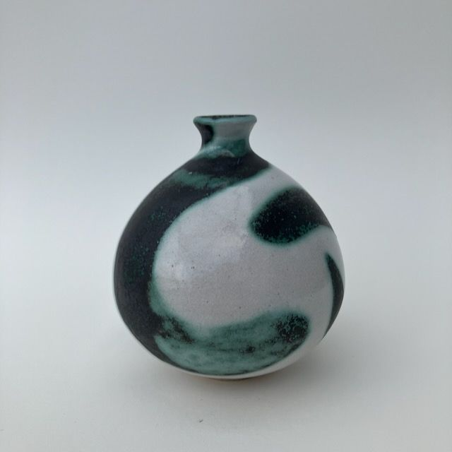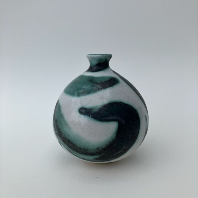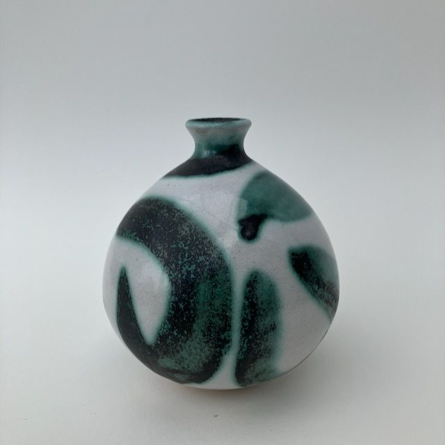 This large, stoneware bud-vase is glazed in white and decorated in free-hand green and black swirls. They have a narrow opening of around 1cm, suitable for a single artfully placed stem.